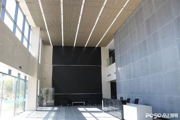 辦公樓大堂采用線性照明方式,簡潔大氣,與大堂通透明快的設(shè)計(jì)風(fēng)格相得益彰。