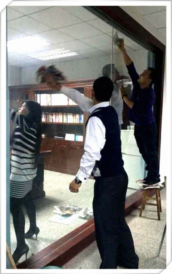 各個職能部門(中心)在各自的辦公區(qū)域中,齊心協(xié)力,互相配合,干勁十足。擦玻璃、擦桌子、掃地、提水、拖地、換水,將雜亂的物品歸類整理整齊并備注類別,以確保所屬辦公區(qū)域清潔無塵。