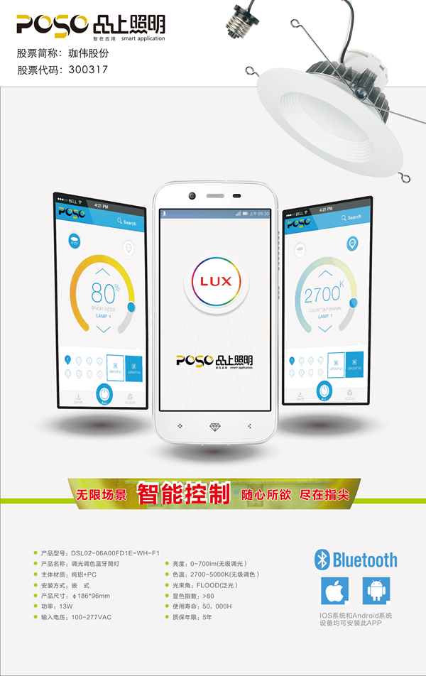 品上照明此次研發(fā)的藍(lán)牙筒燈,在保證光學(xué)系統(tǒng)的前提下,造型時(shí)尚美觀,結(jié)合藍(lán)牙技術(shù),可通過手機(jī)對(duì)燈具進(jìn)行藍(lán)牙智能遙控。該款燈具在實(shí)現(xiàn)藍(lán)牙智能控制的同時(shí),還成功開發(fā)出兩大突破性性能,即:無級(jí)調(diào)光、無級(jí)調(diào)色。不管是安卓系統(tǒng)手機(jī)用戶,還是蘋果手機(jī)用戶,只需在手機(jī)上打開APP,即可在色溫維持不變的狀態(tài)下,0—700lm任意調(diào)節(jié)燈具亮度值,也可以在亮度維持不變的狀態(tài)下,2700K—5000K任意調(diào)節(jié)燈具色溫值。據(jù)了解,目前通過品上照明自主開發(fā)的APP可獨(dú)立控制8-10盞(視手機(jī)操作系統(tǒng)而定)LED藍(lán)牙筒燈。