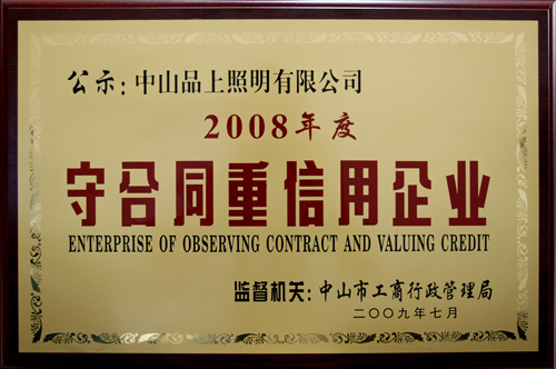 守合同、重信用是一家企業(yè)實(shí)力和素質(zhì)的體現(xiàn)。品上照明在成立之日起,就十分重視誠信文化的建設(shè),特別注重員工職業(yè)道德教育,強(qiáng)化職業(yè)文明和信用意識。在經(jīng)營活動中恪守合同誠信,嚴(yán)格履行合同、規(guī)范運(yùn)作,樹立了良好的企業(yè)信譽(yù)。正是全體員工的努力,我司喜獲中山市“2008年度守合同重信用企業(yè)”。今后,品上人會繼續(xù)努力,將誠信經(jīng)營一如既往的貫徹下去。