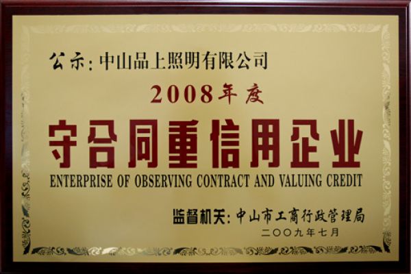 圖/榮譽證書 近日,廣東省中山市工商行政管理局授予品上照明“2008年度守合同重信用企業(yè)”稱號,以表彰我司一直以來的誠信經(jīng)營。 守合同、重信用是一家企業(yè)實力和素質(zhì)的體現(xiàn)。品上照明在成立之日起,就十分重視誠信文化的建設(shè),特別注重員工職業(yè)道德教育,強化職業(yè)文明和信用意識。在經(jīng)營活動中恪守合…